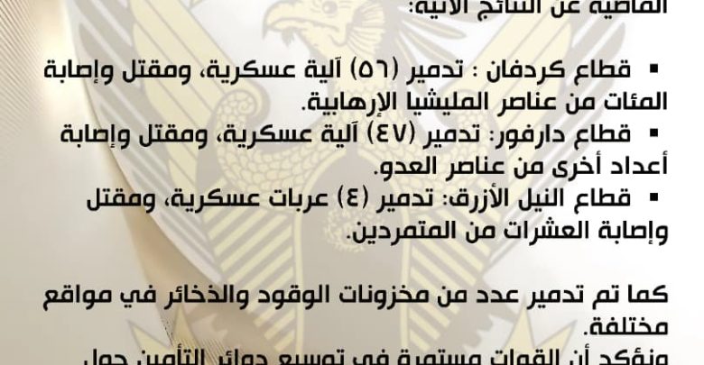تواصل قواتكم المسلحة استهداف تجمعات وتحركات مليشيا آل دقلو الإرهابية، حيث أسفرت العمليات خلال الـ(٧٢) ساعة الماضية عن النتائج الآتية: